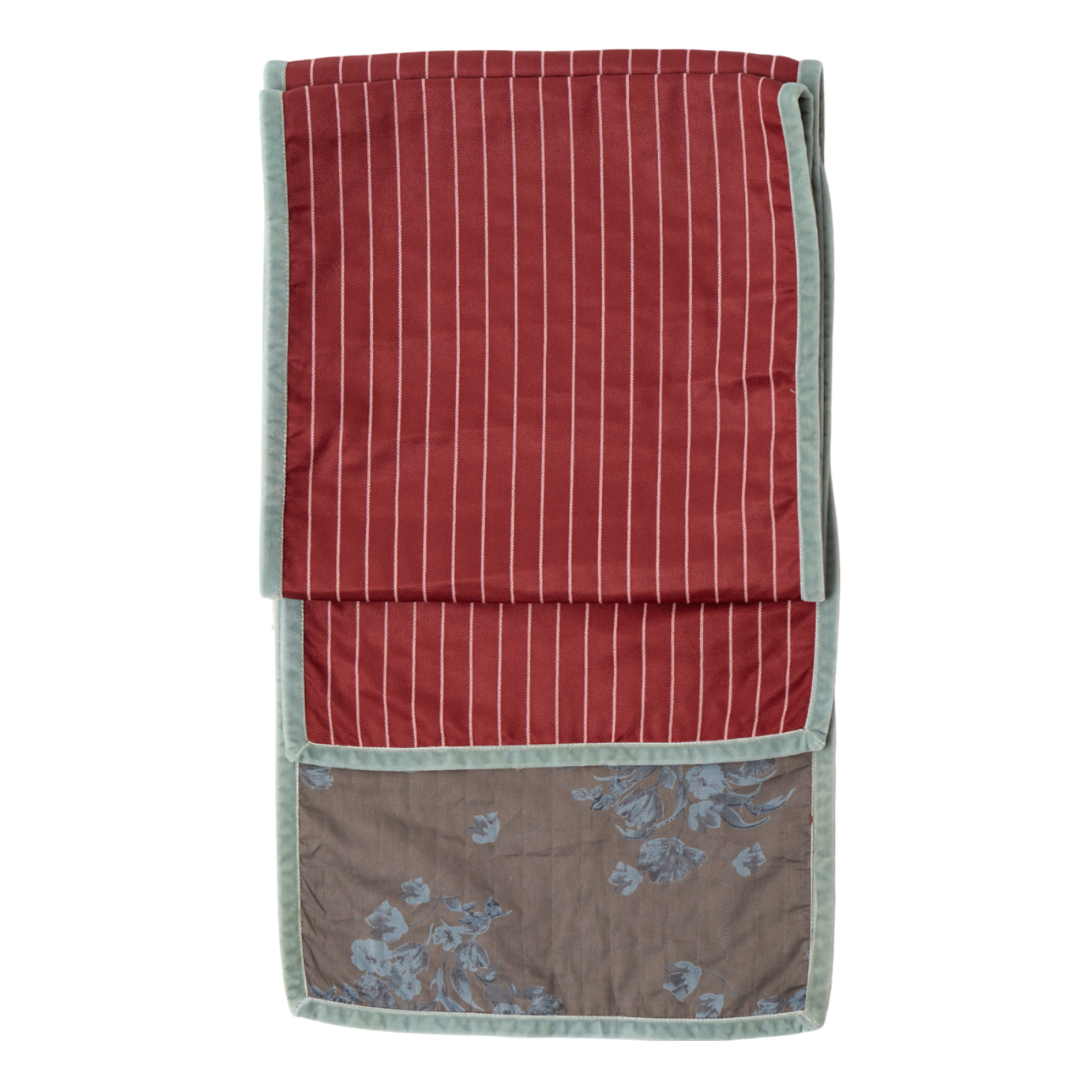 Quilted runner featureing a olive floral cotton print on one side and a maroon striped fabric on the other. The quilting is along the stripes of the maroon fabric. The runner is trimmed with a jade colored velvet trim on all edges.