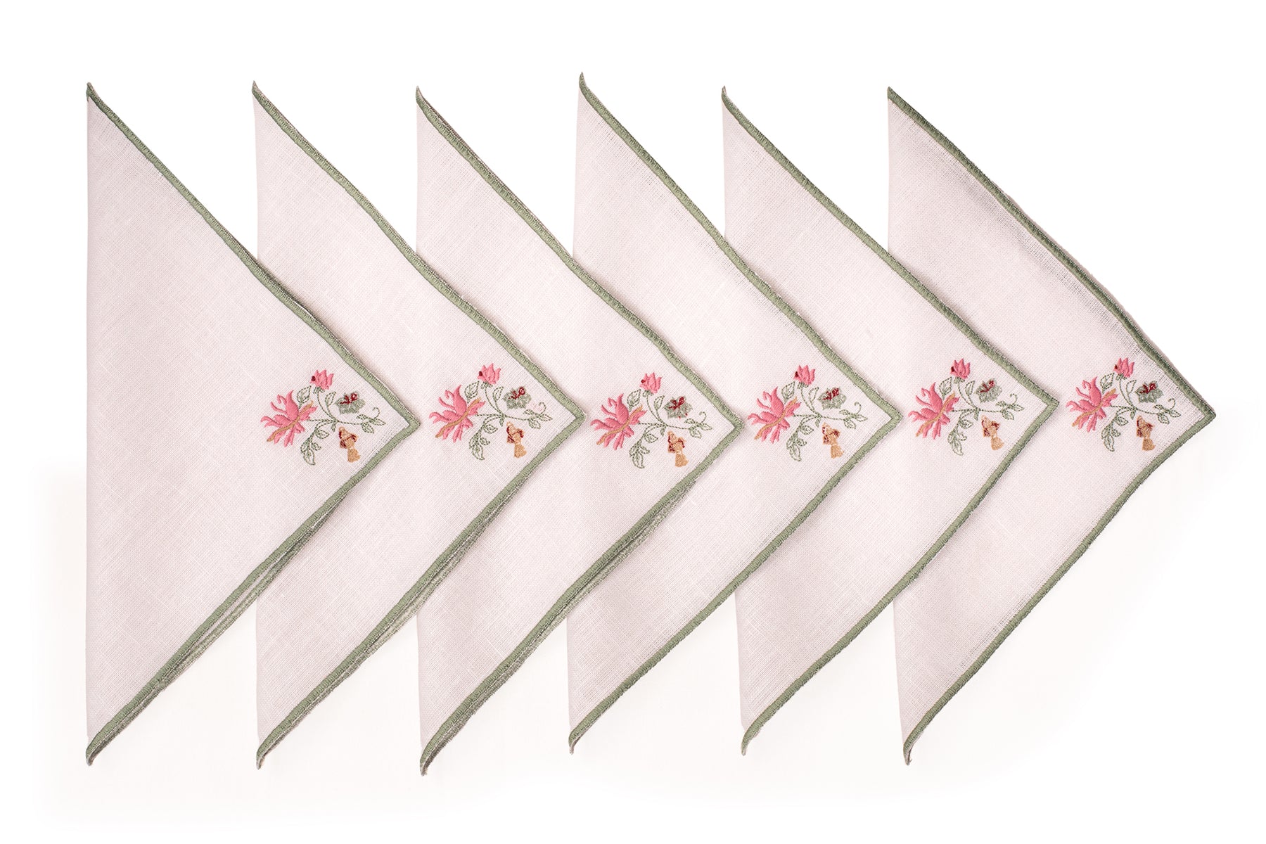 These white linen cocktail napkin with mint green floral detailing are a delight to use.