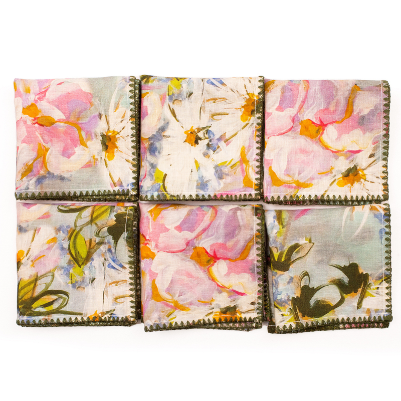 Blue linen pink floral printed cocktail napkin will add joie de vivre to any occasion.
