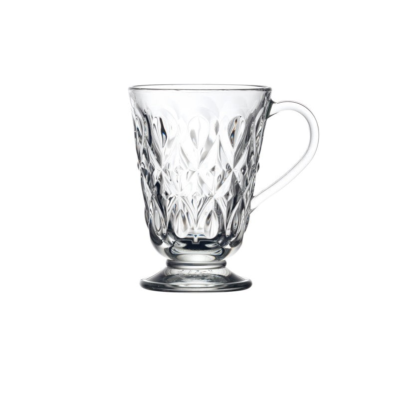 Stemmed mug made of pressed glass, decorated with an almond pattern inspired by the renaissance. From the la rochère 19th century collection.