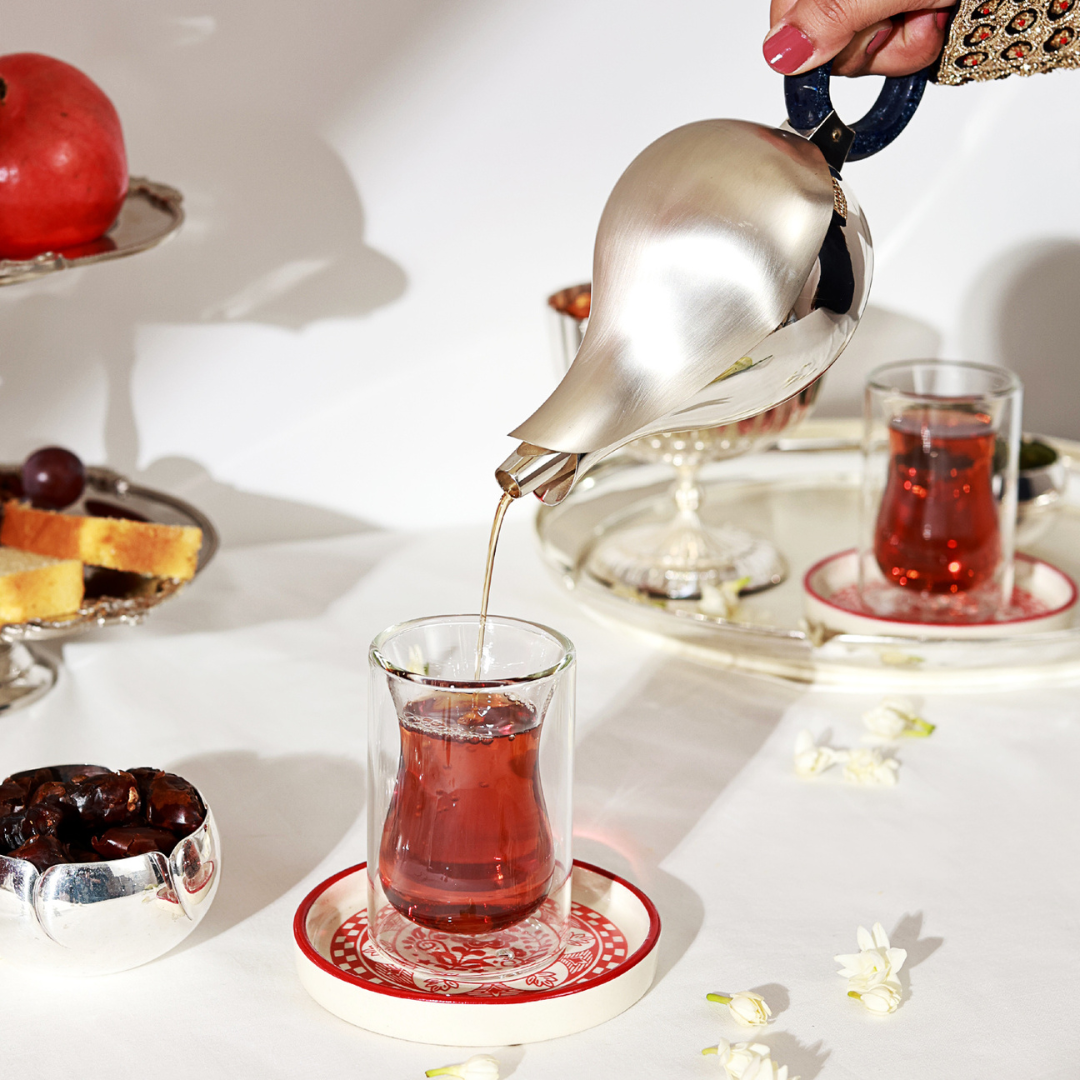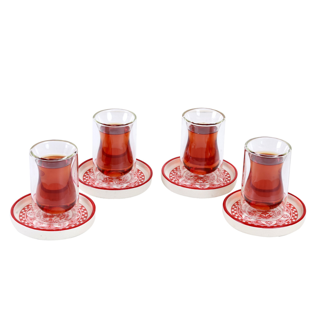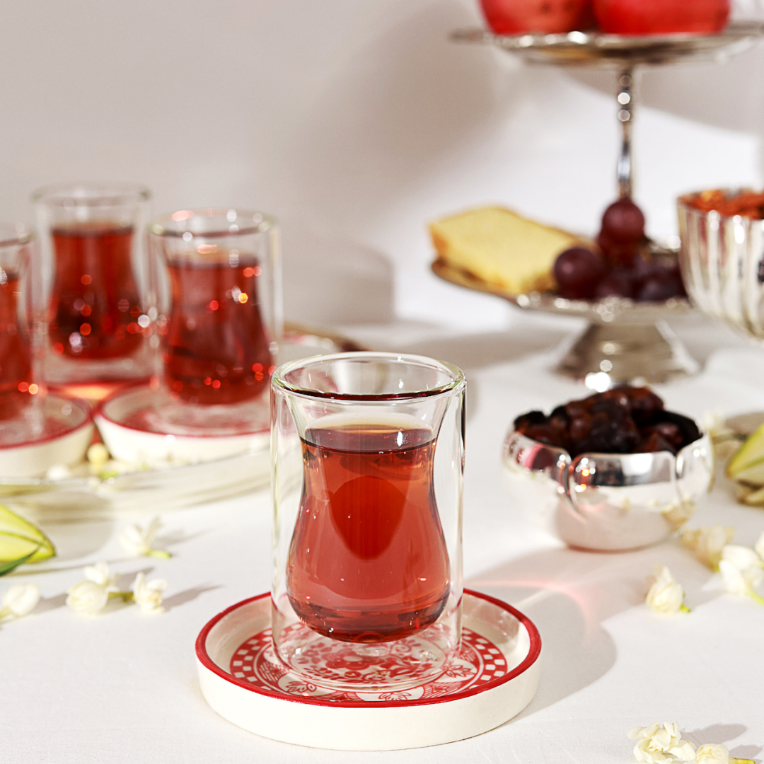 Elevate your tea time with the Noor-e-Kahwa Set, featuring lightweight double-walled glass cups paired with bohemian-style stoneware plates. The blend of transparent glass and textured ceramic creates a stylish mix-and-match look, perfect for both everyday moments and special gatherings.
