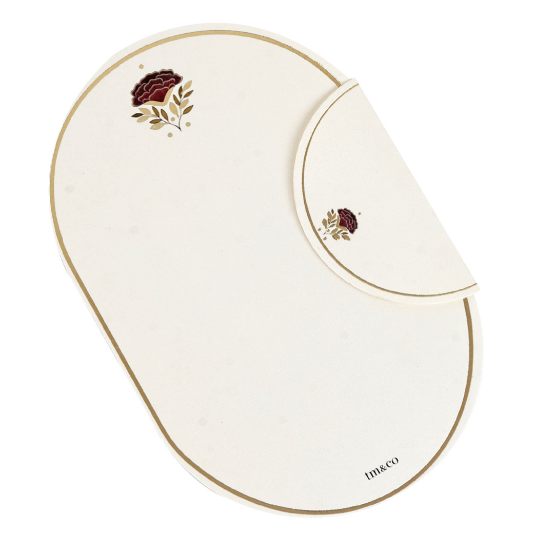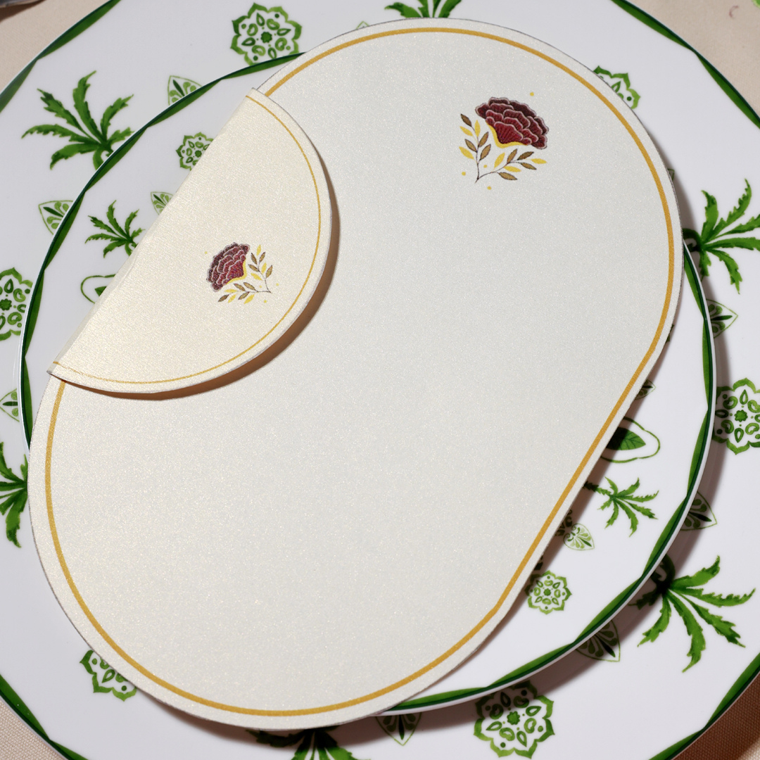 Charm your guests with this oval-shaped customized menu card, adorned with an elegant floral design on top. A perfect blend of fun and sophistication, it sets the tone for weddings, brunches, or soirées with a personal, stylish touch. Customizable with your details, this menu card isn’t just informative—it’s a keepsake that completes your tablescape with flair.
