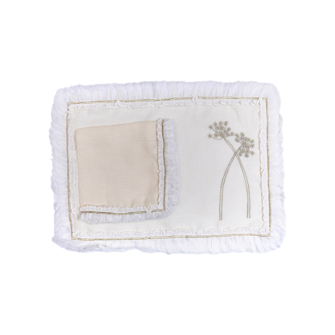 These gorgeous cream linen placemats and napkins and with sliver embroidery make a stunning formal table setting.