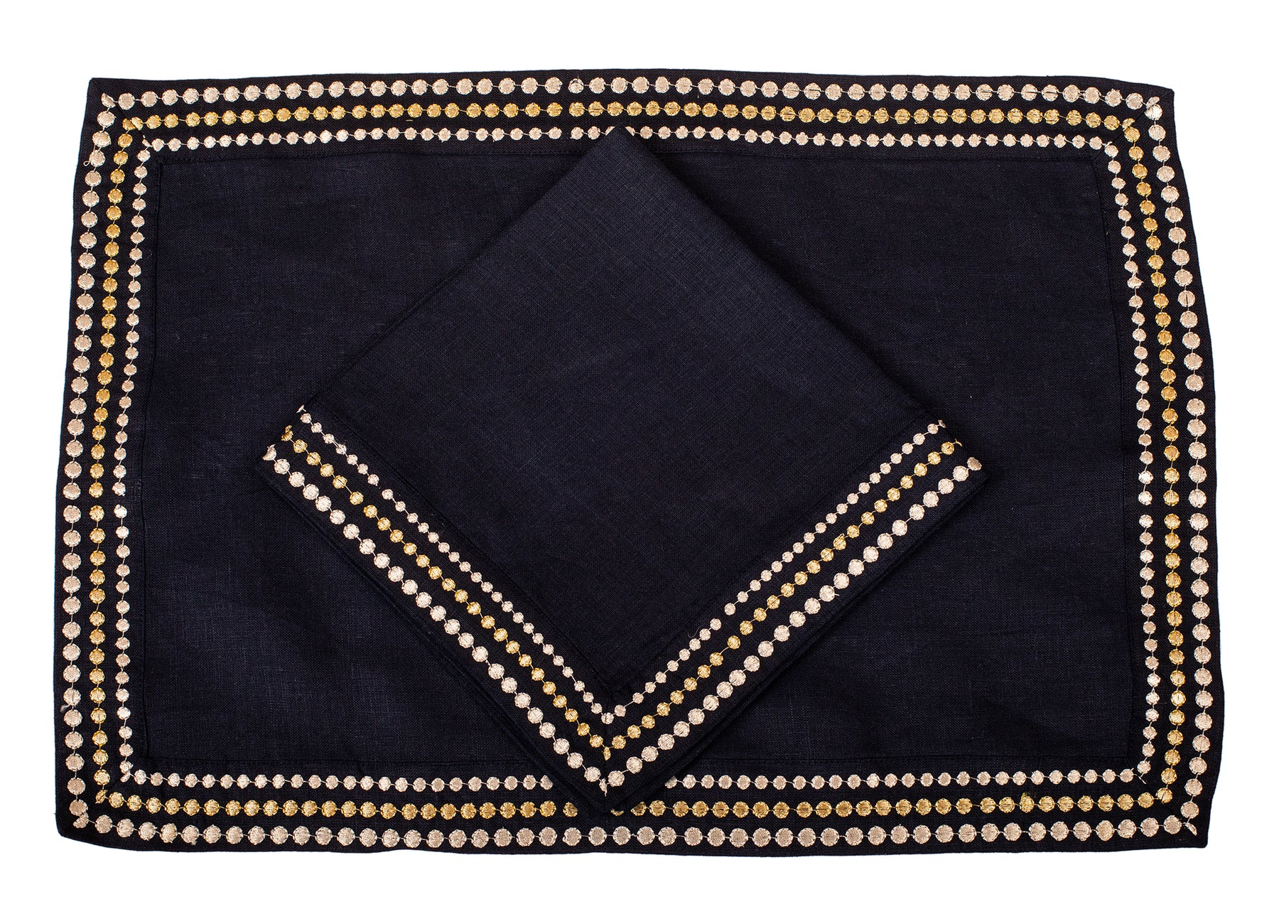 Navy blue linen placemat and napkin with silver embroidery adds glamour to the table decor.