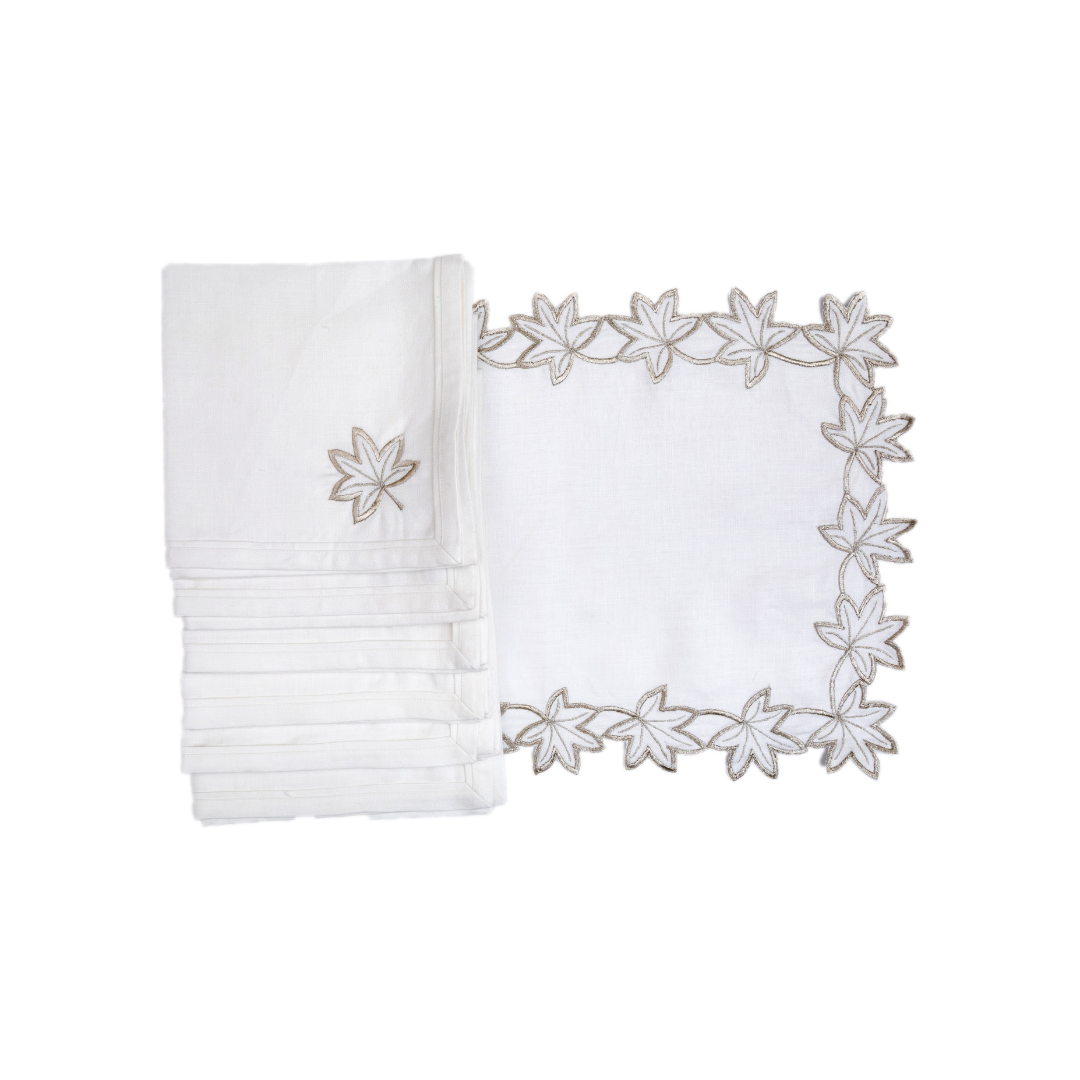 This set of intricate cutwork embroidery all around the placemat with gold embroidered maple leaf motif on the napkin make a dressy table linen set for any formal occasion!