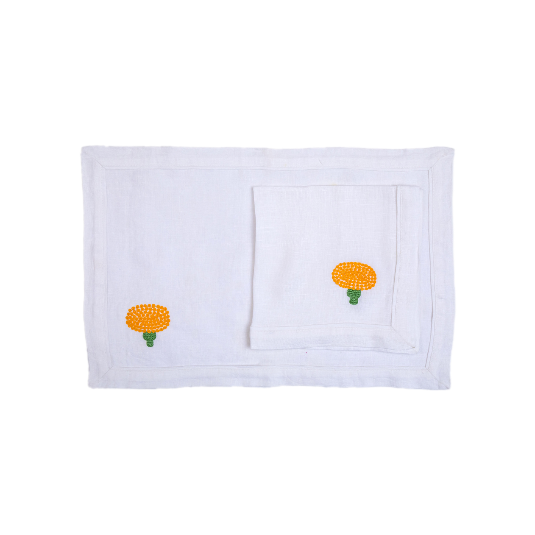 Inspired by the beauty of nature, these marigold blossoms on white linen placemats & napkins enhance the beauty of your home. The alluring colors of these flowers brighten up your dining space.