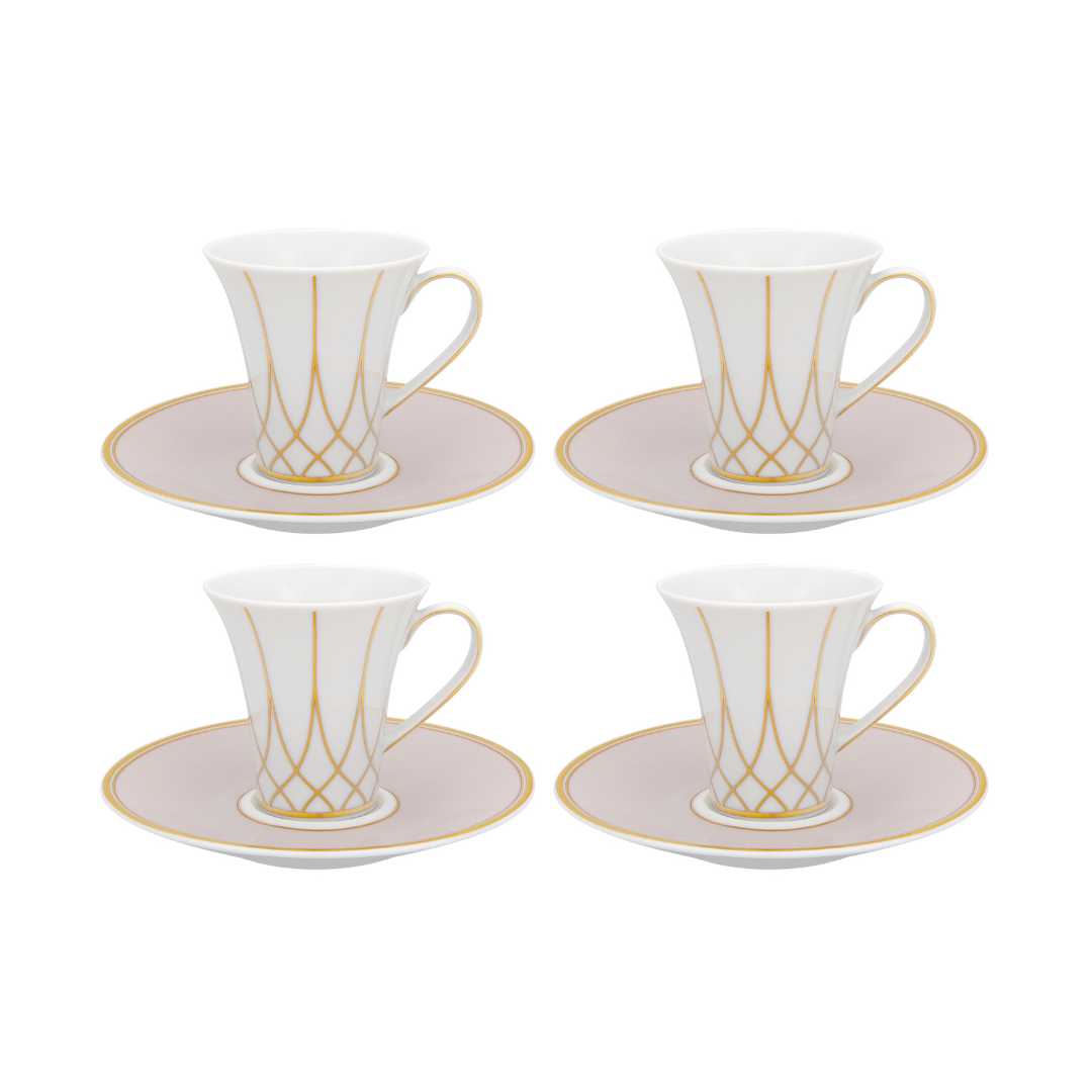 Coffee Cup 9cl & Saucer. Richly decorated in gold, with hand-painted details. New elegant and distinct decoration. This new dinner set with a style that refers back to the Gothic art of the Renaissance era, results in a classic decoration with contemporary and timeless elements.