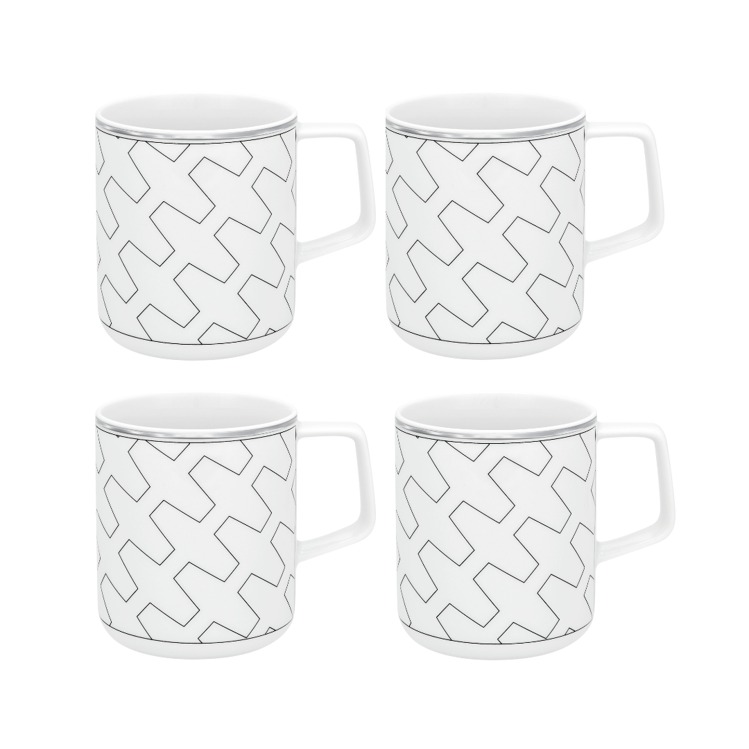 Mug. A contemporary dinner set with geometric lines in platinum. "Trasso" is the new contemporary decoration of the Silkroad model. Marked by architectural lines with geometric motifs demarcated in platinum, providing distinction and sophistication to the line. "Trasso" is a collection that has influences from various cultures leading you to enjoying moments of relaxation influenced by Eastern culture, combined with the sophistication of Western tableware lines.