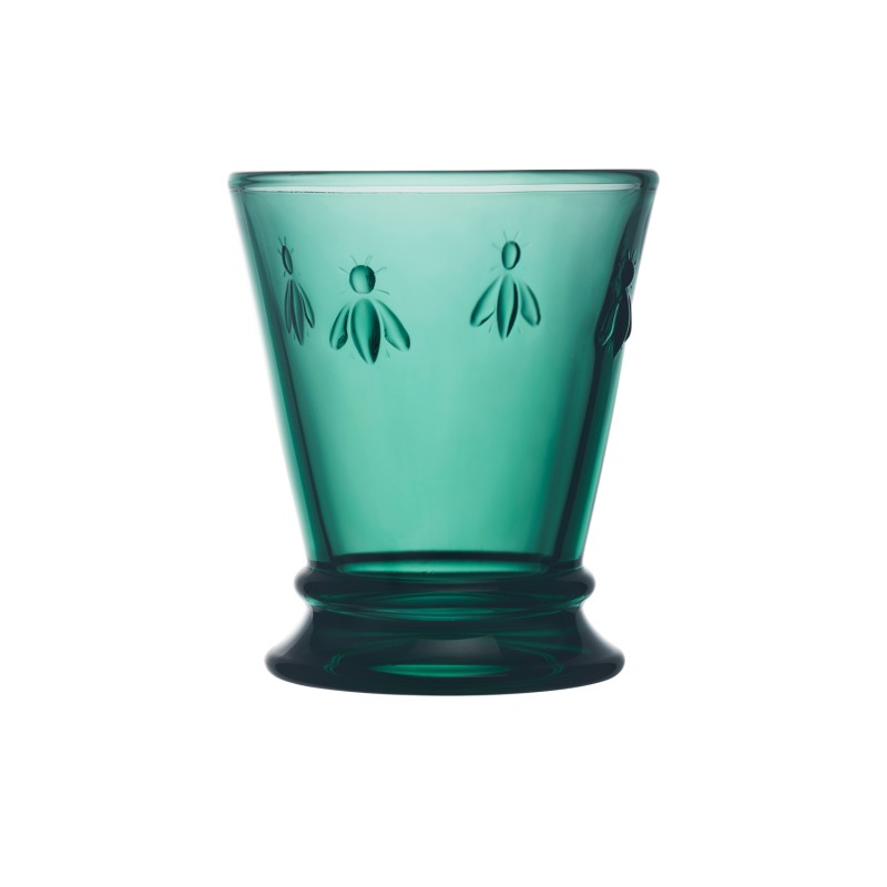 Emerald green tumbler made of pressed glass, mass-coloured and decorated with four bees. This collection features the symbols of napoleon's leather goods.