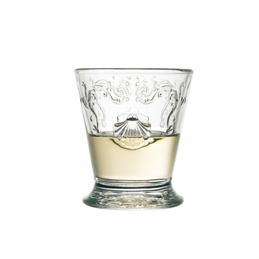 Tumbler made of pressed glass, decorated with baroque raised motif of scrolls, flowers and scallops.