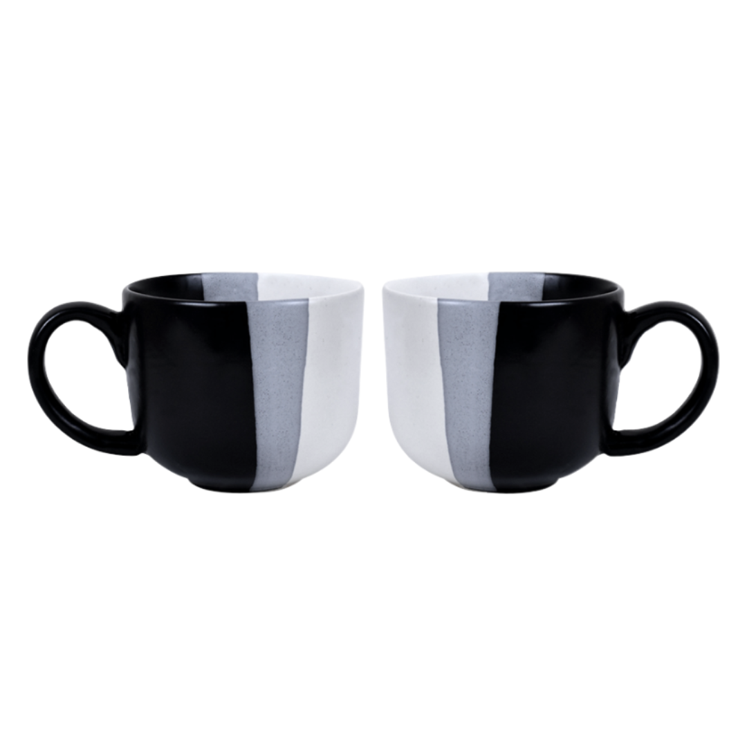 Handcrafted in stoneware, this generously sized coffee mug blends ivory, black, and subtle hints of grey for a sophisticated, contemporary look. Its artisanal craftsmanship and large capacity make it perfect for enjoying your favorite beverages with modern elegance.