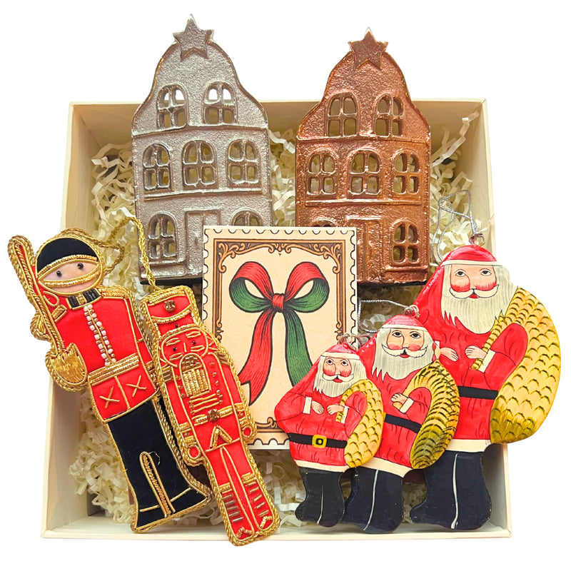 Inspired by traditional European Christmas décor, this curated box brings together handcrafted festive accents with timeless charm. It includes a pair of ornate Christmas tea lights in silver and rose gold finishes, a hand-painted papier mâché ornament set, and two distinct embroidered ornaments. Each piece is rich in detail, making this box a keepsake-worthy gift that celebrates craftsmanship, nostalgia, and holiday warmth.