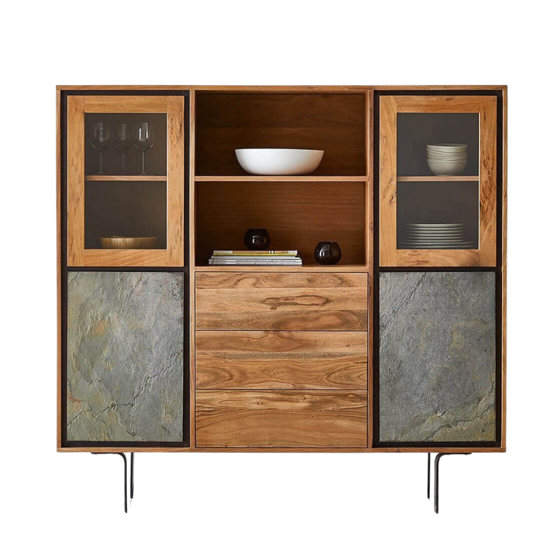 Maximize your kitchen storage with our Jarrah Crockery Unit. Featuring two glass doors, two closed doors, and three push-to-open drawers, this cabinet offers ample space for your dishes and utensils. The two open shelves provide easy access to everyday essentials. Organize your kitchen with style and convenience. Constructed from durable acacia wood and complemented by sleek metal legs. The door front is a unique feature, with an original thin stone layer on MDF, creating a natural and assorted pattern that ensures no two pieces are 100% identical, adding a touch of intrigue to your kitchen decor. The metal legs are knockdown, making assembly a simple DIY task.