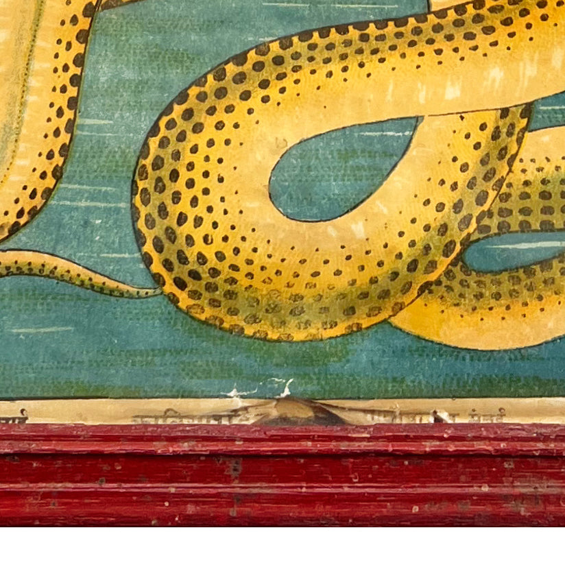 Depicting the episode of Kāliya Mardan, this chromolithograph shows Krishna subduing the serpent Kāliya in the waters of the Yamuna. Krishna is presented crowned and flute-bearing, standing upon the multi-hooded serpent, while the Nāginīs appear in attitudes of supplication. The composition is set within a pastoral landscape animated by riverine detail, temple architecture and distant hills. Produced by the Raja Ravi Varma Press in the early twentieth century, the work exemplifies the press’s distinctive synthesis of academic figuration and decorative colour, developed for mass dissemination through chromolithography. The strong palette, finely articulated outlines and balanced narrative composition are characteristic of the press’s mythological subjects, which played a significant role in shaping popular visual culture in India. The print is preserved in its original period frame. Condition: Light surface wear, minor foxing and toning, with slight colour softening and marginal edge wear, all consistent with age; frame shows commensurate wear.