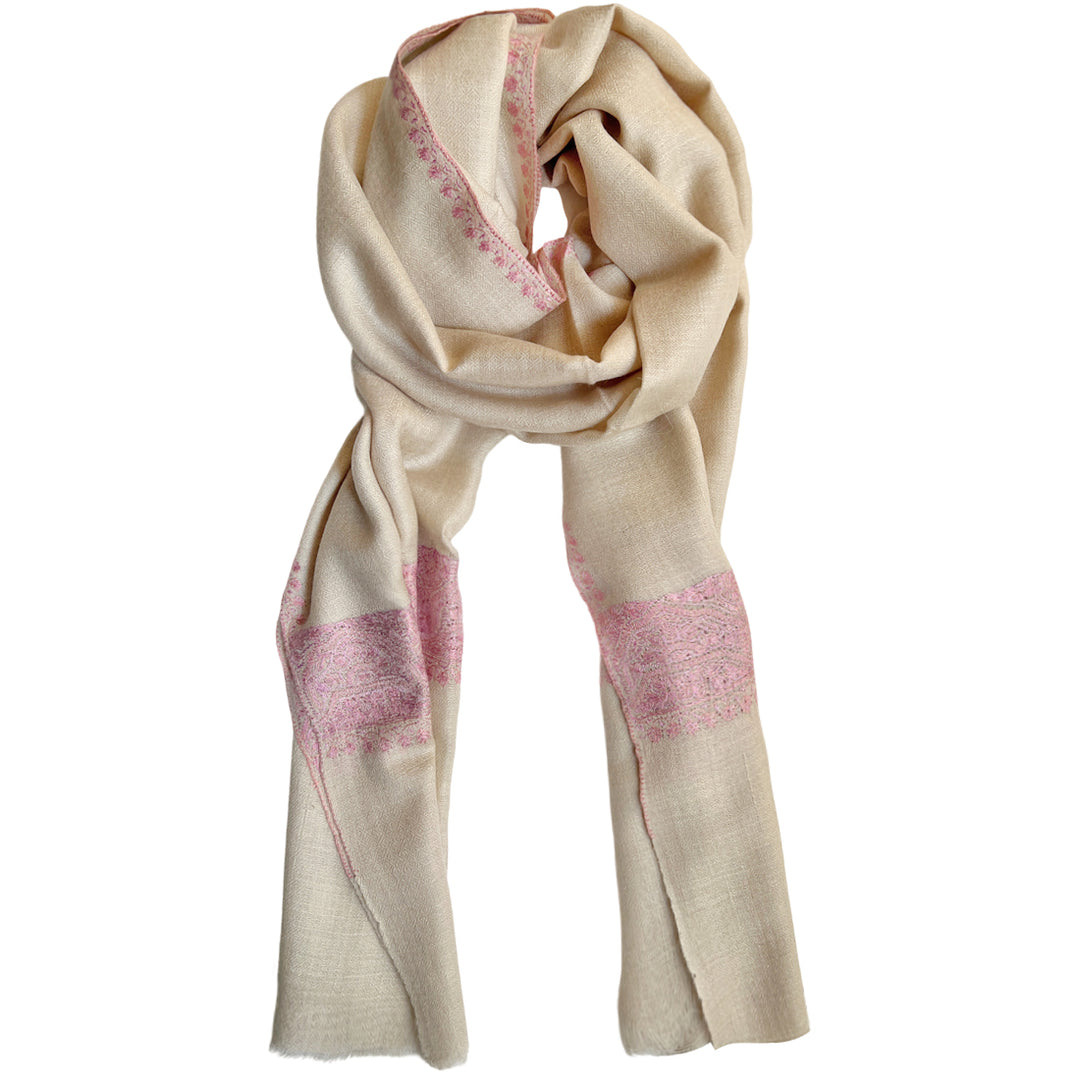 Wrap yourself in luxury with this hand-embroidered pashmina stole, showcasing intricate borders and bird motifs crafted by skilled artisans. This timeless piece is a testament to the ancient craft of hand embroidery, requiring hours of patient stitching to create its unique and breathtakingly beautiful design. Made from soft, fine pashmina fabric, this stole is a unique handmade accessory that drapes elegantly around your neck, perfect for adding a touch of elegance to any outfit.