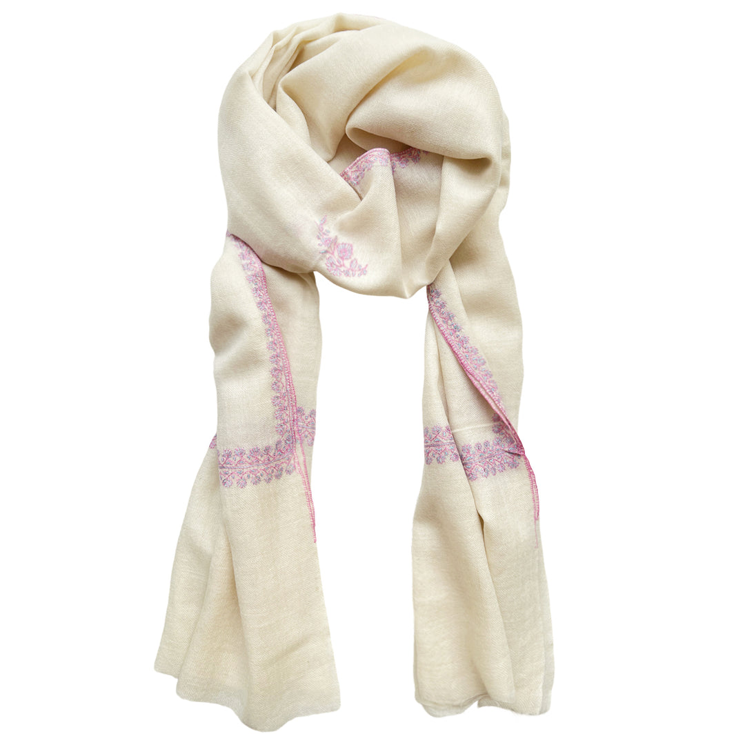 Wrap yourself in luxury with this hand-embroidered pashmina stole, showcasing intricate borders and motifs crafted by skilled artisans. This timeless piece is a testament to the ancient craft of hand embroidery, requiring hours of patient stitching to create its unique and breathtakingly beautiful design. Made from soft, fine pashmina fabric, this stole is a unique handmade accessory that drapes elegantly around your neck, perfect for adding a touch of elegance to any outfit.