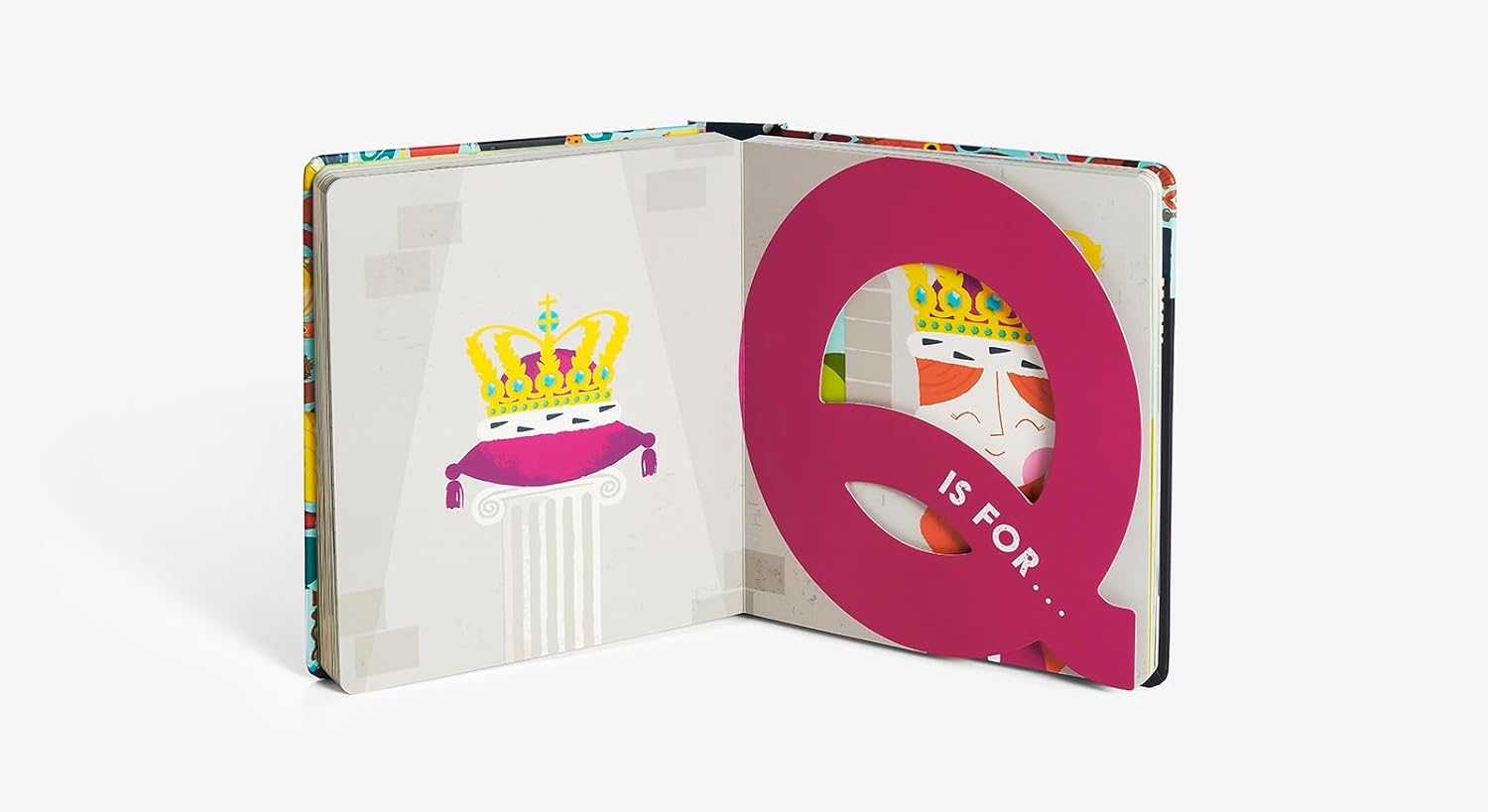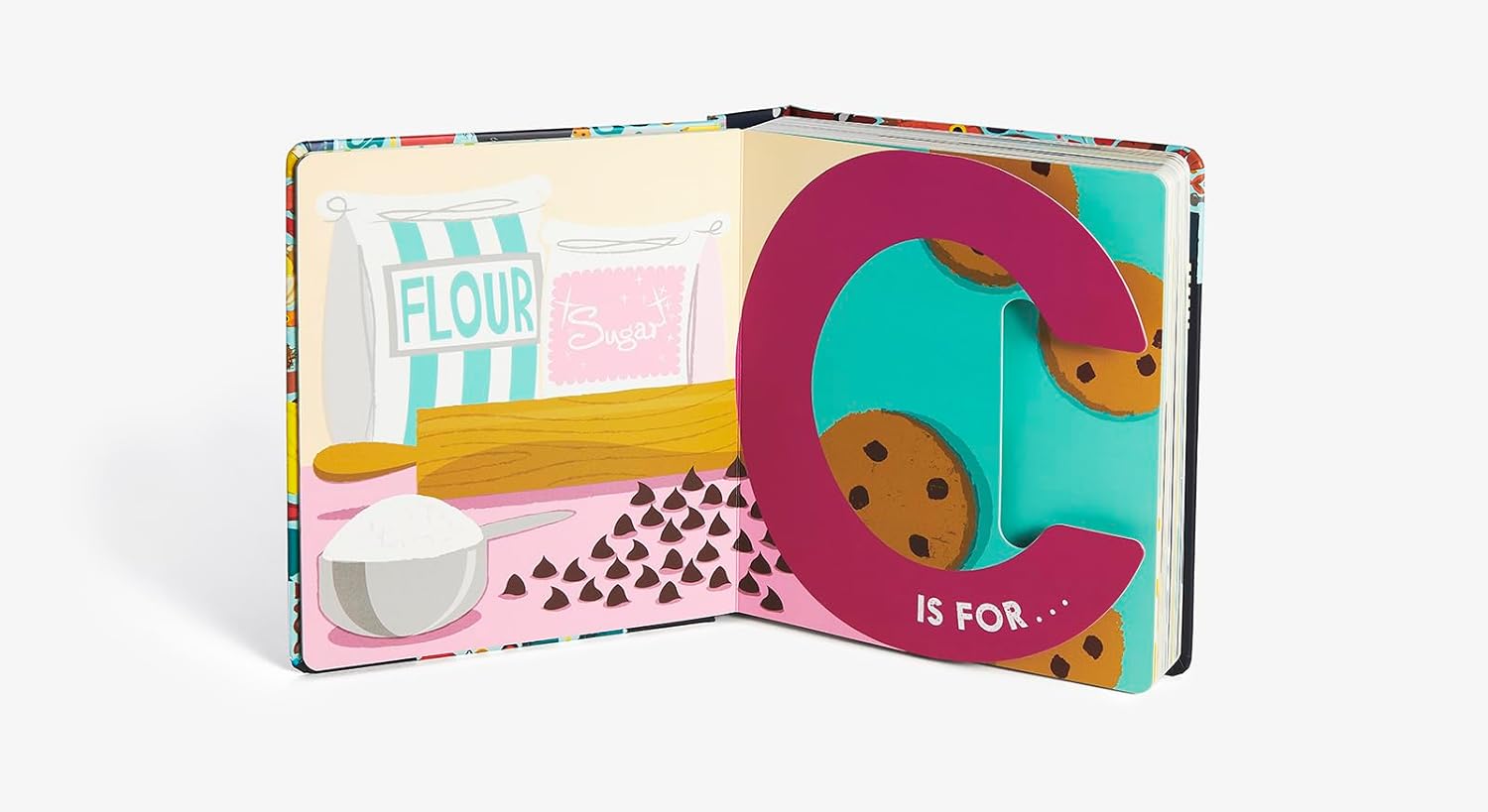 Sprinkles, hot fudge, and cherries hint at I’s ice cream sundae, while aquarium accessories hint at F’s fish. As readers interact with the pages, they will familiarize themselves not only with the 26 letters and associated words, but also with each letter’s physicality—angles, holes, and curves, both front and back.
