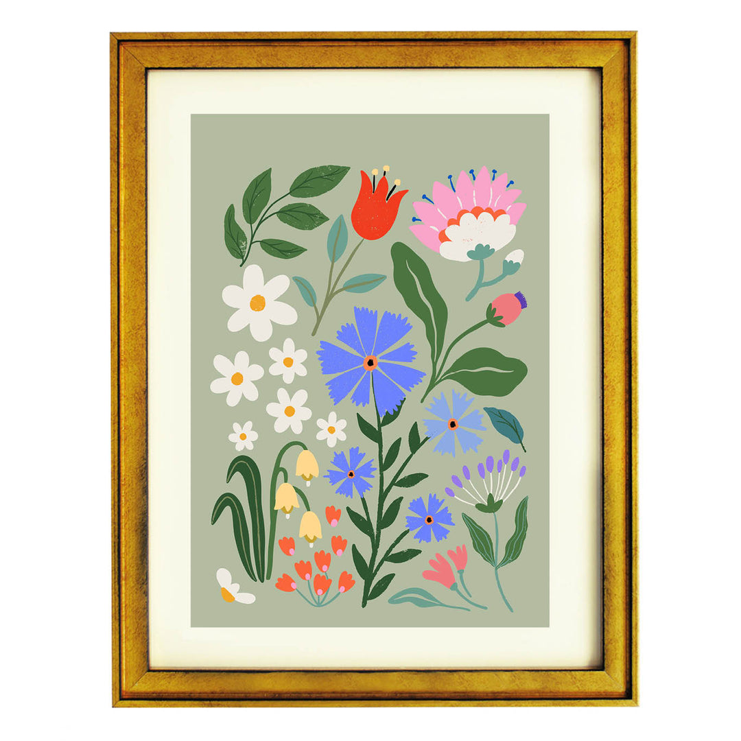 A celebration of wildflowers in cheerful hues, this botanical print is brimming with charm. From daisies to poppies, it brings a lively, painterly touch to bedrooms, hallways, or any space longing for nature’s flourish.