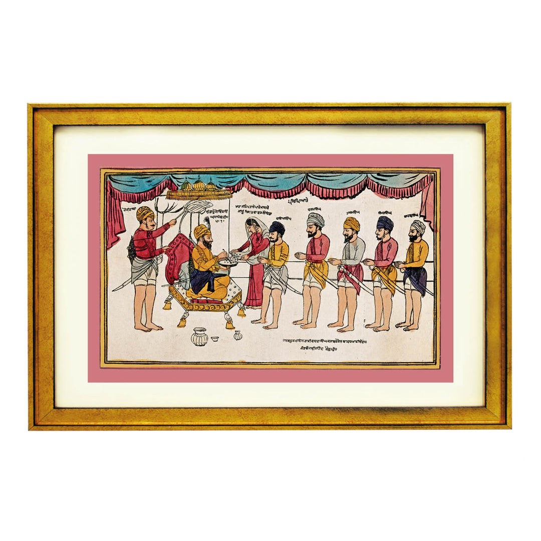 This historical Sikh artwork depicts Guru Gobind Singh in a defining moment—the creation of the Khalsa in 1699. Seated on an ornate throne, the Guru stirs Amrit (nectar) in an iron bowl, preparing to initiate his first five disciples, the Panj Pyare (Five Beloved Ones), into the warrior-saint order of the Khalsa. A noblewoman offers sugar, symbolizing the perfect blend of strength and compassion, while the disciples stand in solemn devotion, ready to embrace their new identity as defenders of righteousness.