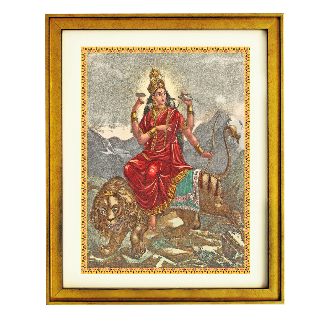This exquisite art print depicts Goddess Jagadhatri, a powerful form of the Divine Mother in Hindu mythology. Seated majestically on a lion, she embodies strength, compassion, and protection. Her four arms hold a conch, a discus, a sword, and a water pot, symbolizing her power to create, preserve, and destroy. With her serene gaze and radiant smile, Goddess Jagadhatri inspires awe and devotion. This piece beautifully showcases the intricate artistry and vibrant details of traditional Indian art.